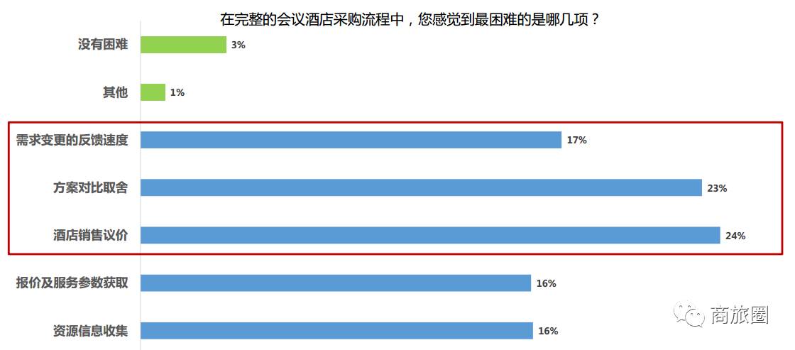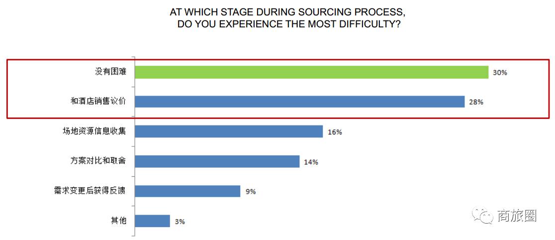 在采购会议酒店的周期中,中国会议买家认为最困难的是三大环节是:1)和酒店销售议价,2)方案的对比取舍,3)需求变更后酒店的反馈速度。或许是因为整体年龄和经验明显比中国同行资深,接受调研的美国会议买家中有30%的人表示并无困难,剩余受访者则表示挑战最大的是酒店议价环节。