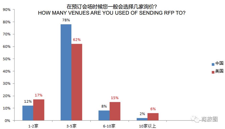 中国会议买家发询价RFP时,80%都会选择3-5家酒店/场地资源进行比较;而美国的会议买家的习惯则更为多元化。