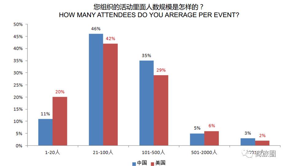 根据2016年的数据,虽然中美参与调研的活动组织者在全年累计组织的会议次数方面的情况类似(第三方公司会议偏多,直客大多少于5次),但中国会议策划者更多地是在处理人数较多的会议。相比之下,美国的会议策划者则有20%的精力是在处理20人内的小微会议。