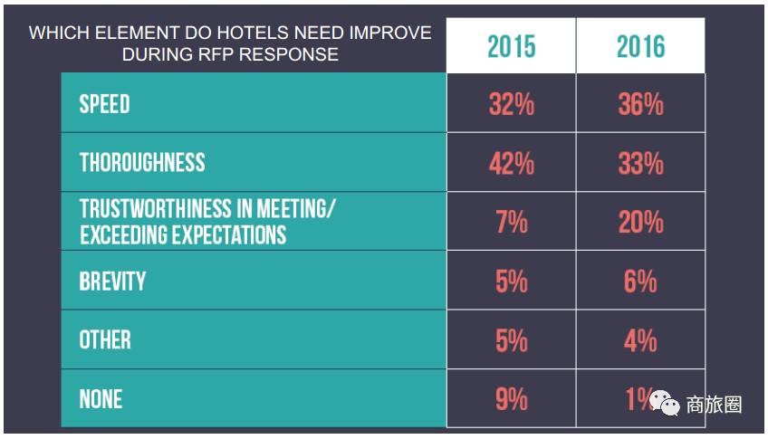 就综合反馈来看,中国会议买家对酒店销售回复RFP时的三大期待包括:报价内容完整、报价快速和直接报底价;美国会议买家对酒店销售回复RFP最不满的则是报价速度的问题。