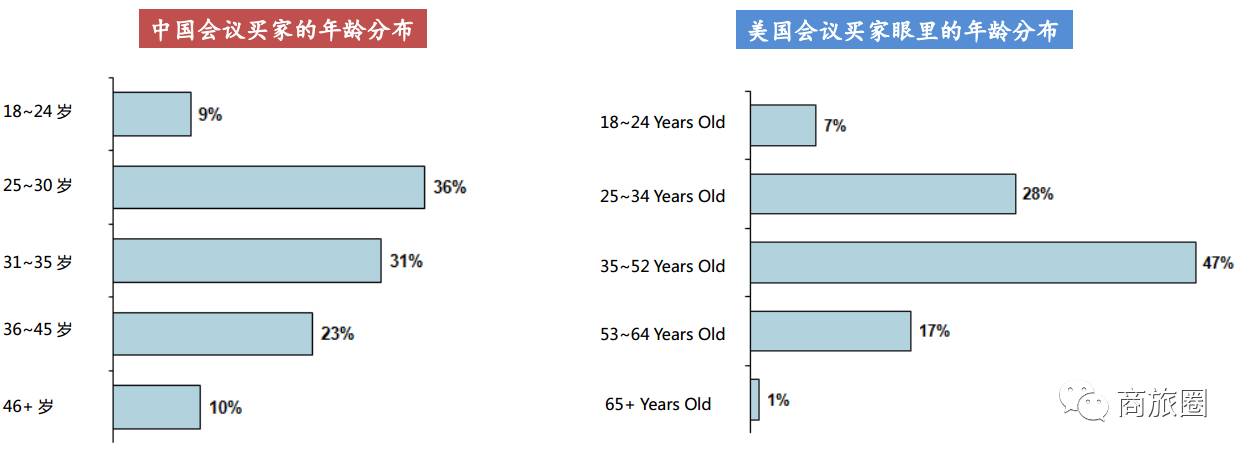 调研分析显示,中国75%的会议买家的年龄是35岁以下,而美国65%的会议买家年龄却在35岁以上。
