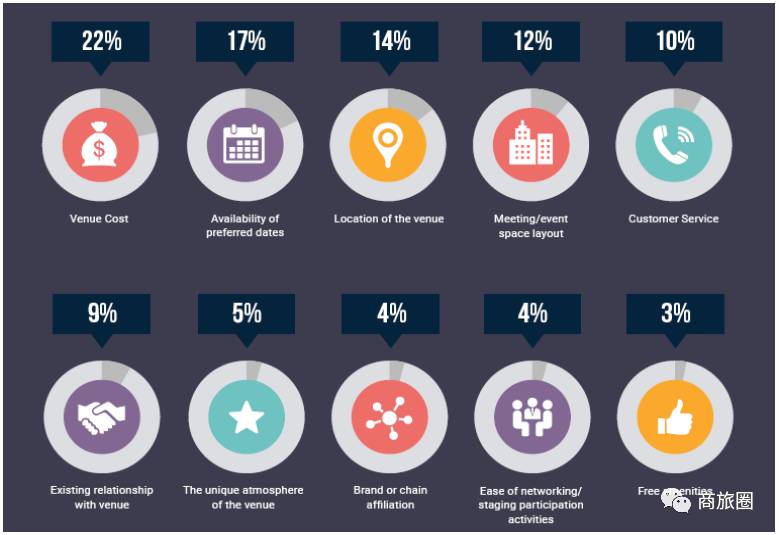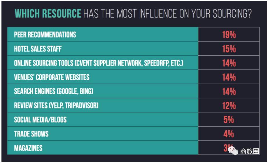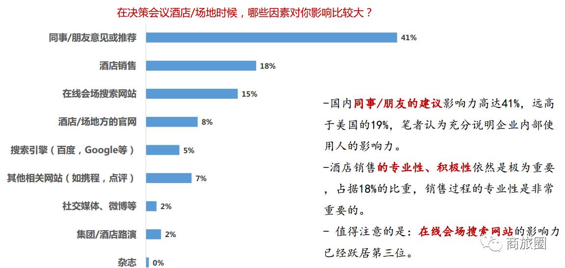 影响中国会议买家采购决策的三个最重要的因素依次是:同事朋友的意见(41%)、酒店销售(19%)和在线会场搜索网站(15%)。对于美国的会议买家来说,最主要影响因素则是在线渠道(包括专业场地搜索平台14%,酒店官网14%和搜索引擎14%)。