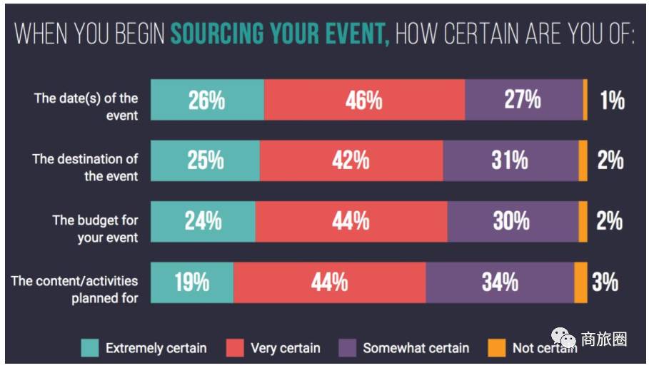美国会议买家在会议询价采购前,会议城市的选择更加明确,但仅有64%的比例是已确认了活动内容安排, 完全确定预算的仅19%。