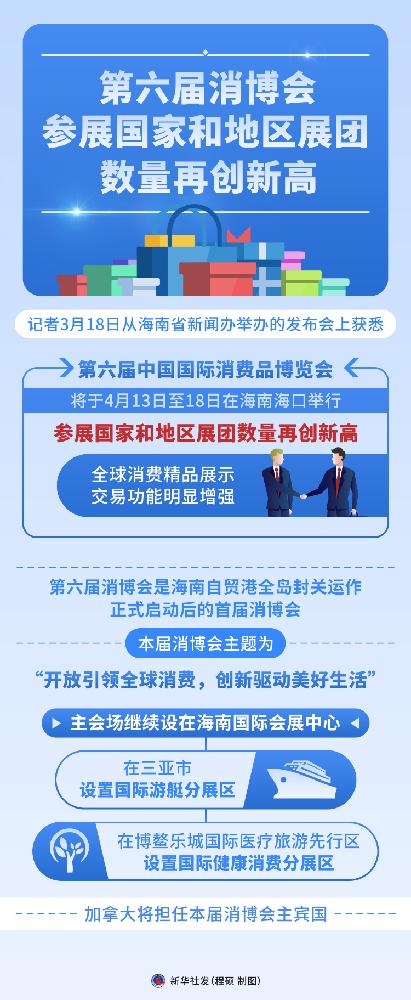 新华社海口3月18日电(记者罗江、王存福)记者18日从海南省新闻办举办的发布会上获悉,第六届中国国际消费品博览会将于4月13日至18日在海南海口举行,参展国家和地区展团数量再创新高,全球消费精品展示交易功能明显增强。