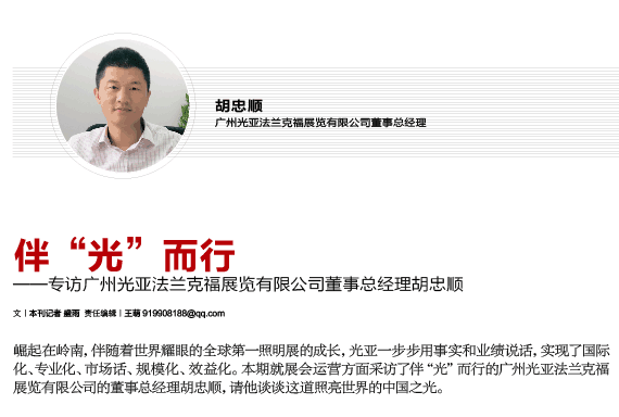 崛起在岭南,伴��着世界耀眼的全球第一照明展的成长,光亚一步步用事实和业绩说话,实现了国际化、专业化、市场化、规模化、效益化。本期就展会运营方面采访了伴“光”而行的广州光亚法兰克福展览有限公司的董事总经理胡忠顺,请他谈谈这道照亮世界的中国之光。