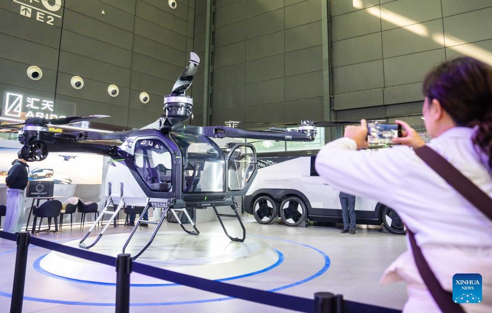 A visitor takes photos of the flight module of a flying car on display at the 21st Changsha International Automobile Expo in Changsha, central China's Hunan Province, on Dec. 10, 2025. The 6-day expo kicked off on Wednesday at the Changsha International Convention and Exhibition Center, showcasing some 1,000 vehicles from over 70 automobile brands. (Xinhua/Chen Sihan)