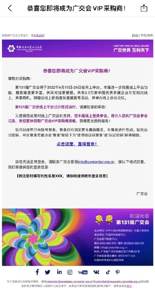 记者近日获悉,广交会在发给采购商的邮件中提到,第131届广交会将于2022年4月15日—24日在网上举办。