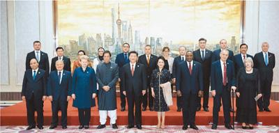 宴会在欢乐祥和的气氛中进行。习近平同各国领导人亲切交谈。各国嘉宾畅叙友谊合作,共同祝愿首届中国国际进口博览会圆满成功,祝愿各国携手共同发展,世界更加和平繁荣。