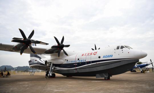 中国自主研制的大型水陆两栖飞机——“鲲龙”AG600在展示区内(11月5日摄)。新华社记者 邓华/摄