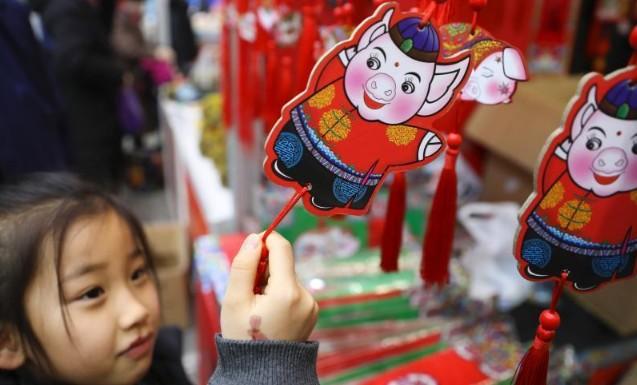 1月23日,正在北京全国农业展览馆举办的2019老北京年货大集人头攒动、热闹非凡。全国各地区优质特色产品及民俗文化在此一一呈现,给北京市民带来精彩纷呈的购物体验。图为小女孩被年货大集上的猪年福牌吸引。中新社记者 赵隽 摄