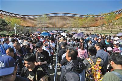 5月1日,世园会,中国馆外的游客排起长队,等待进馆参观游览。新京报记者 侯少卿 摄