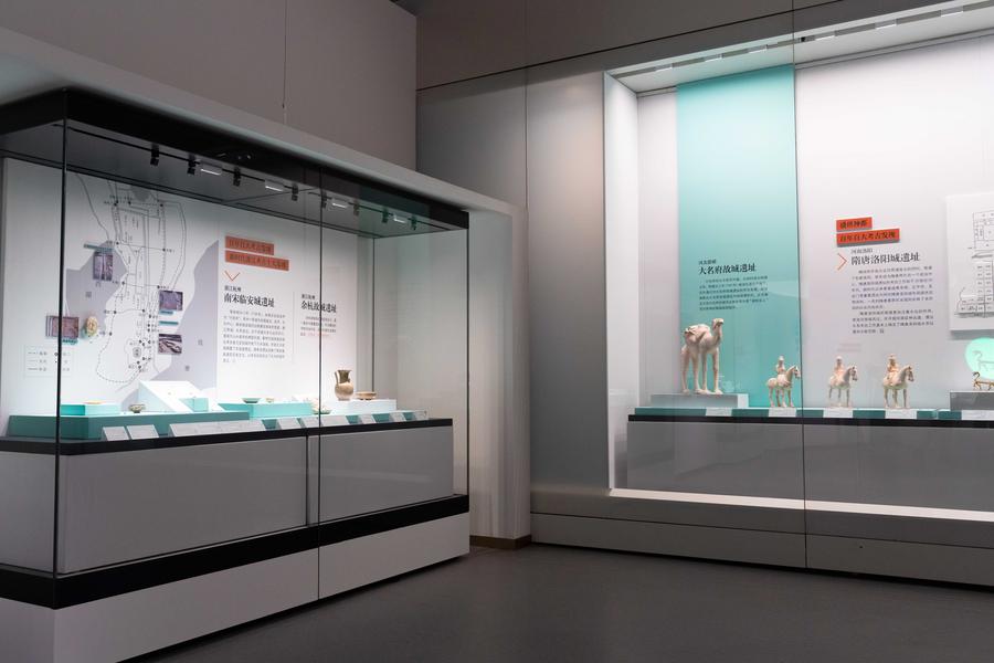A brick with inscriptions from the Sui Dynasty (581-618), a Tang Dynasty (618-907) tri-colored glazed ceramic woman figurine playing polo and a bluish-white glazed bowl with flower carvings from the Song Dynasty (960-1279) are among the displayed items.