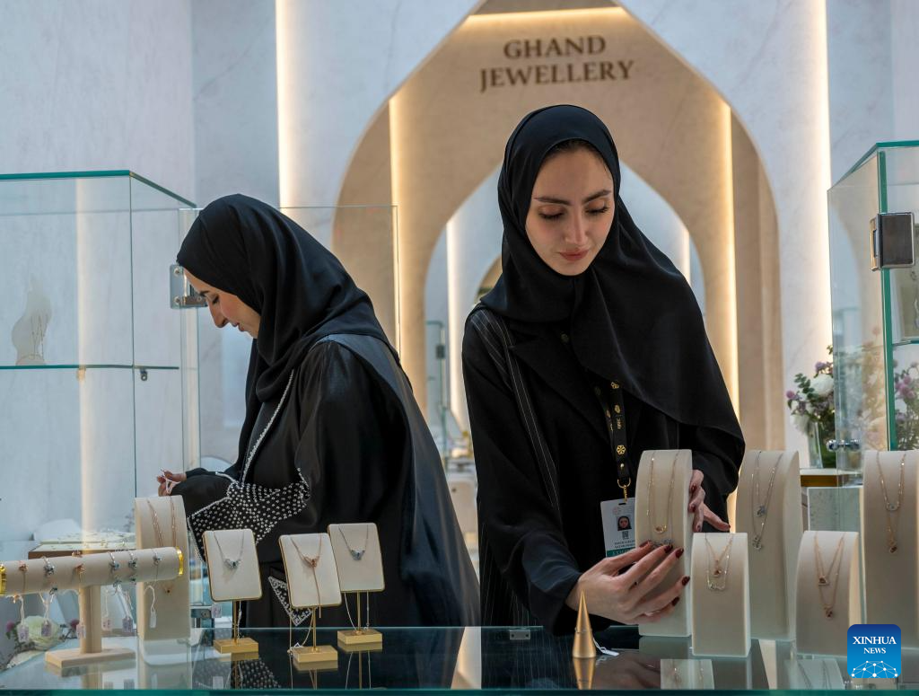 Exhibitors arrange jewelry at the 21st edition of Doha Jewelry and Watches Exhibition in Doha, Qatar on Jan. 31, 2025. The exhibition opened on Jan. 30 and will last until Feb. 5.