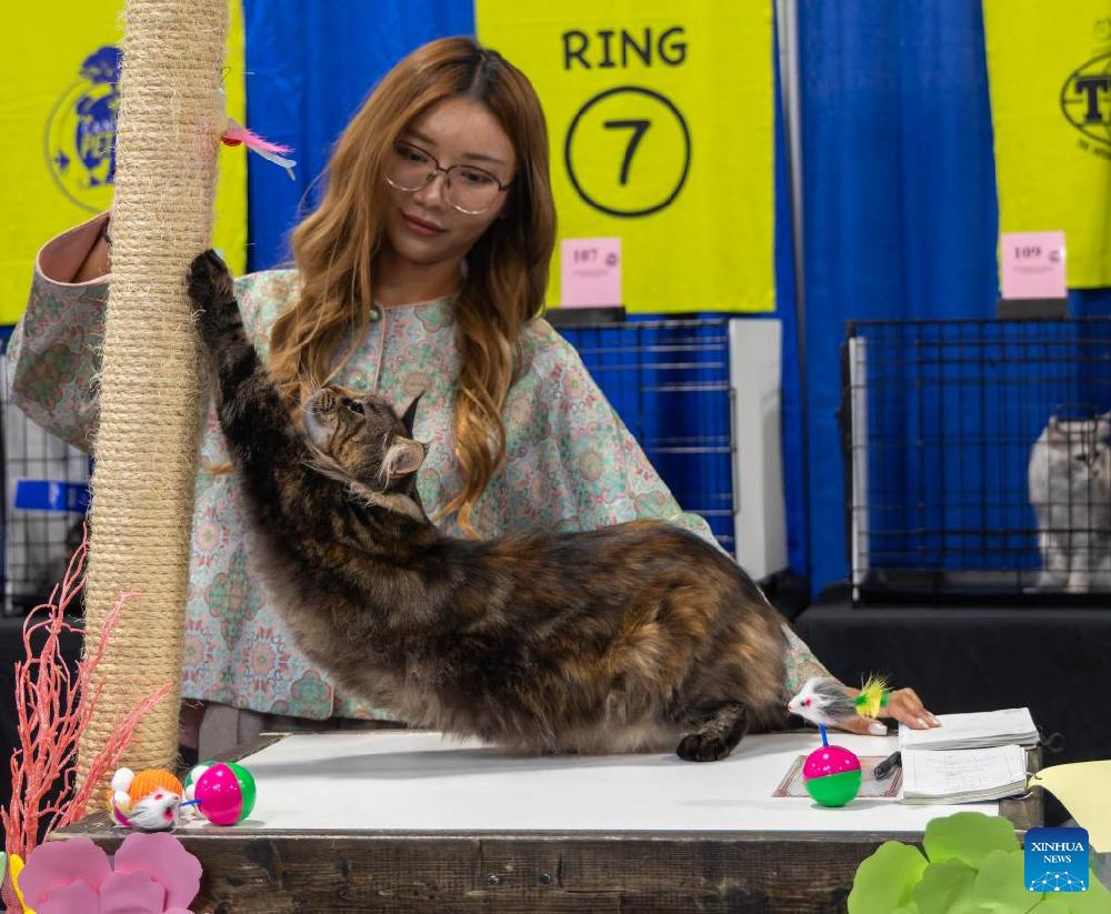 A judge checks a pet cat at the 2026 Spring Canadian Pet Expo in Mississauga, Ontario, Canada, on April 3, 2026. Featuring a pet marketplace, pet competitions and more, this three-day event kicked off here on Friday and will last until Sunday. (Photo by Zou Zheng/Xinhua)