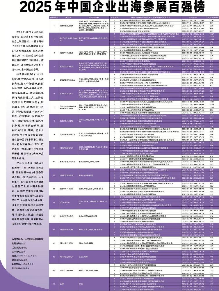 2025年,中国企业积极出海参展,在全球不少行业顶尖展会上积极亮相。本榜单列举了2025年中企参展数量最多的100场海外展会,涵盖20大行业,每个行业筛选出中企参展数量排名前5位的展会。数据显示,这100场展会吸引了超40000家中国企业参展。