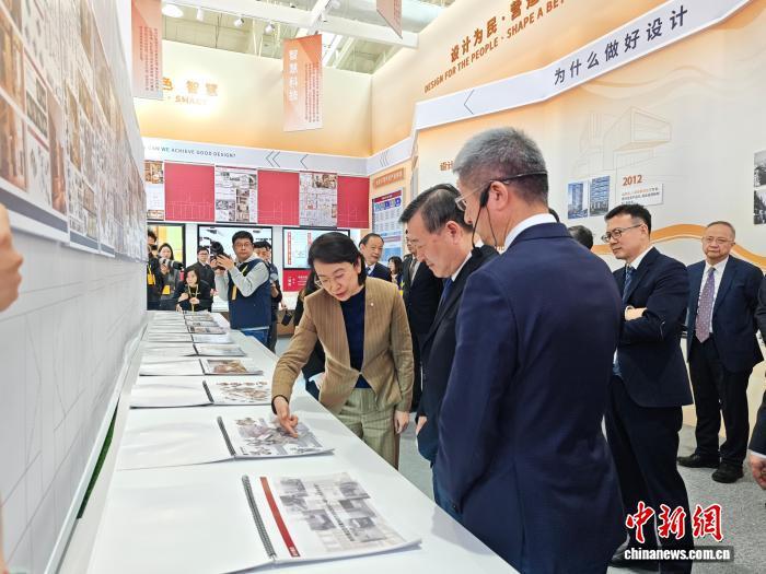 成果发布会现场,同期举办了大赛获奖作品展。通过模型、视频和展板,以及主创设计师分享介绍等多种形式,展示获奖作品的设计理念与创新亮点。倪虹带领参会人员巡展,观看模型演示,听取获奖主创人员讲解设计创意,不时提出问题、交流观点。