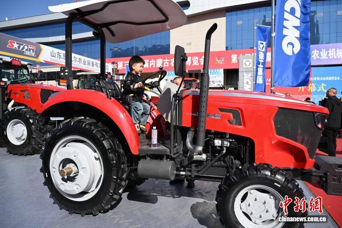 3月26日,内蒙古呼和浩特市,儿童“试乘”农机。当日,第三十八届内蒙古农业博览会在内蒙古国际会展中心启幕,展会为期3天。展会展出面积5万平方米,吸引了来自全国28个省区市的900余家涉农企业、科研及气象保险机构参展,现场设立展位超1500个。