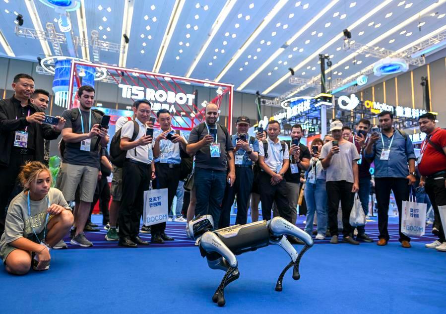 A robotic dog produced by CVTE, which is a high-tech company focused on interactive display and AI, has been widely photographed at the fair. Empowered by the company's self-developed AI algorithms, the robotic dog can climb slopes of up to 35 degrees with ease, and can operate smoothly on grass, gravel and sand surfaces.