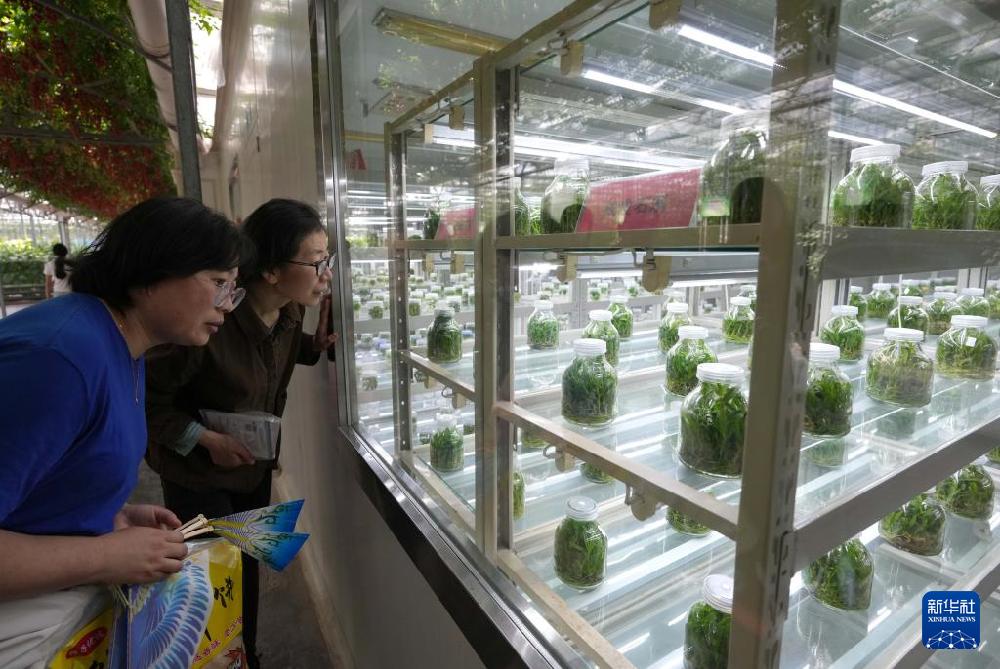 4月20日,在第二十六届中国(寿光)国际蔬菜科技博览会上,人们在观看植物组织培养设备。